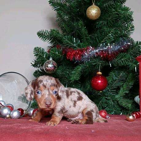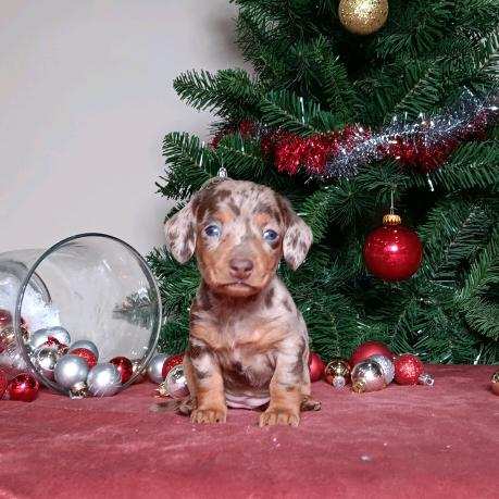 Hello, this is Vaughn! She’s a little cutie, with her shorthaired, chocolate merle coat and 2 shining eyes! She loves to play with her siblings and also loves to be held and cuddled! She will be sure to shower you with lots of kisses!
