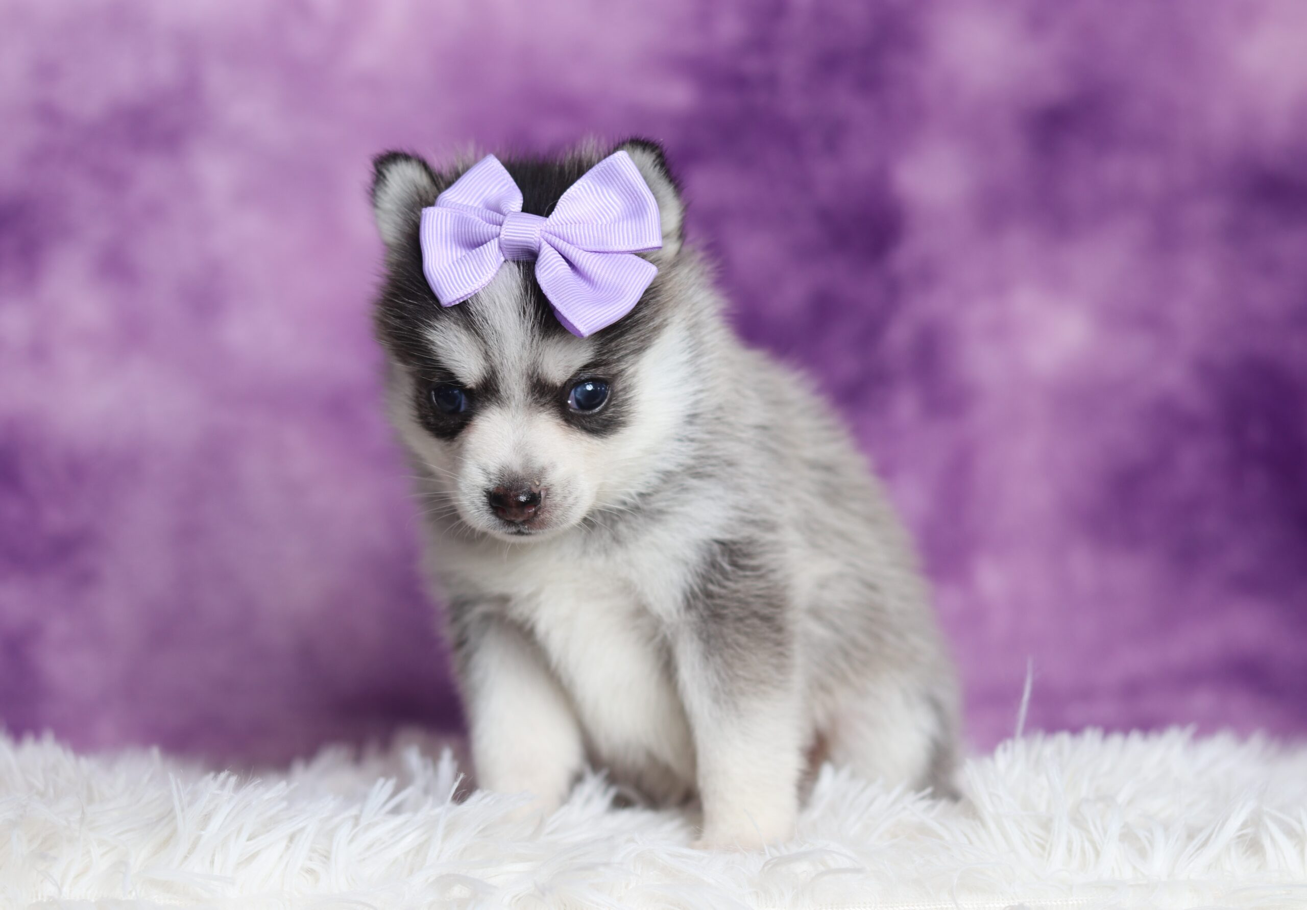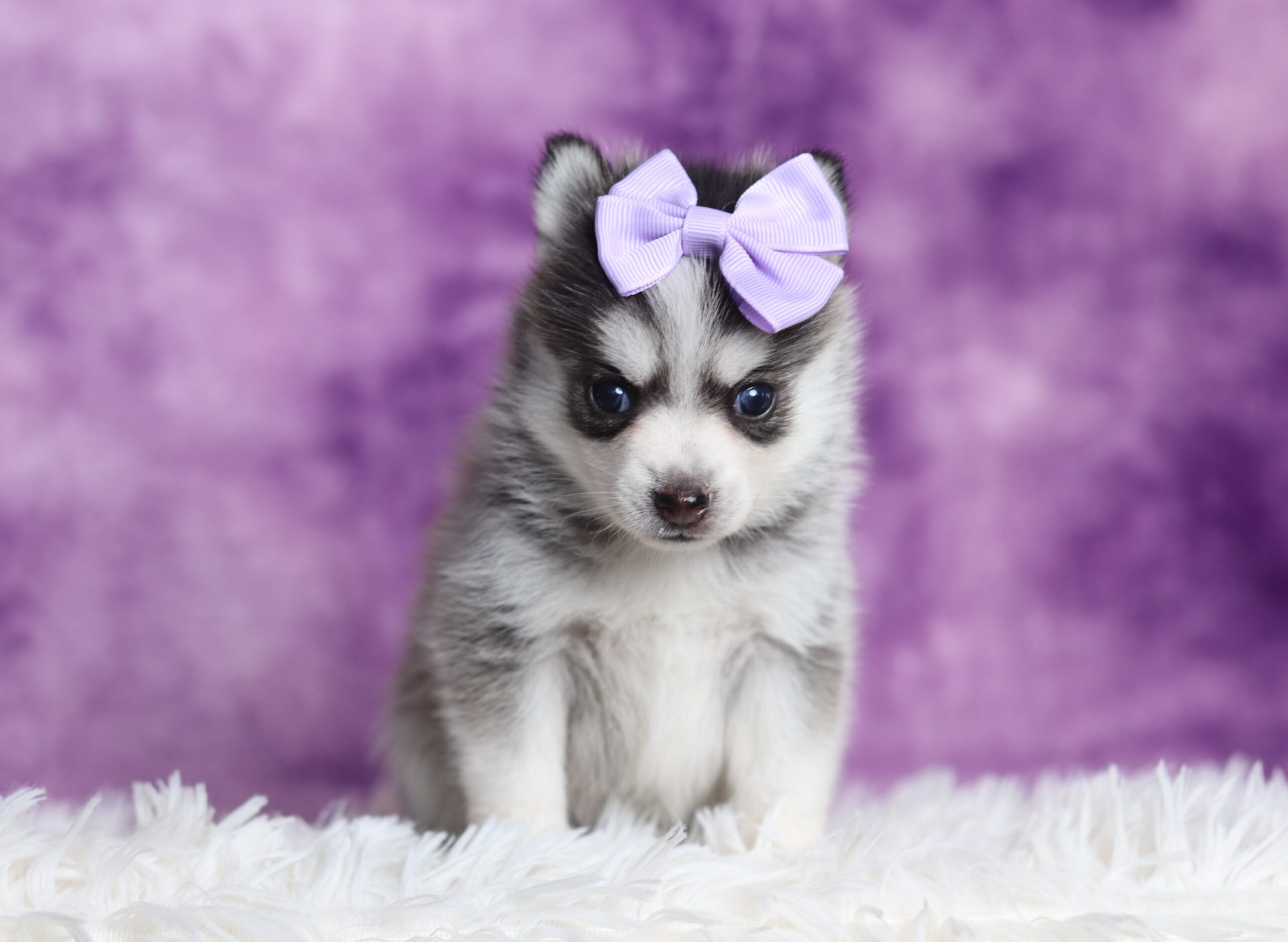 Hi there! This is Violet a sweet little Pomsky girl! She has a nice black and white coat! She is happiest when she is with you, snuggling by your feet or cuddling on your lap, that is just what she loves!